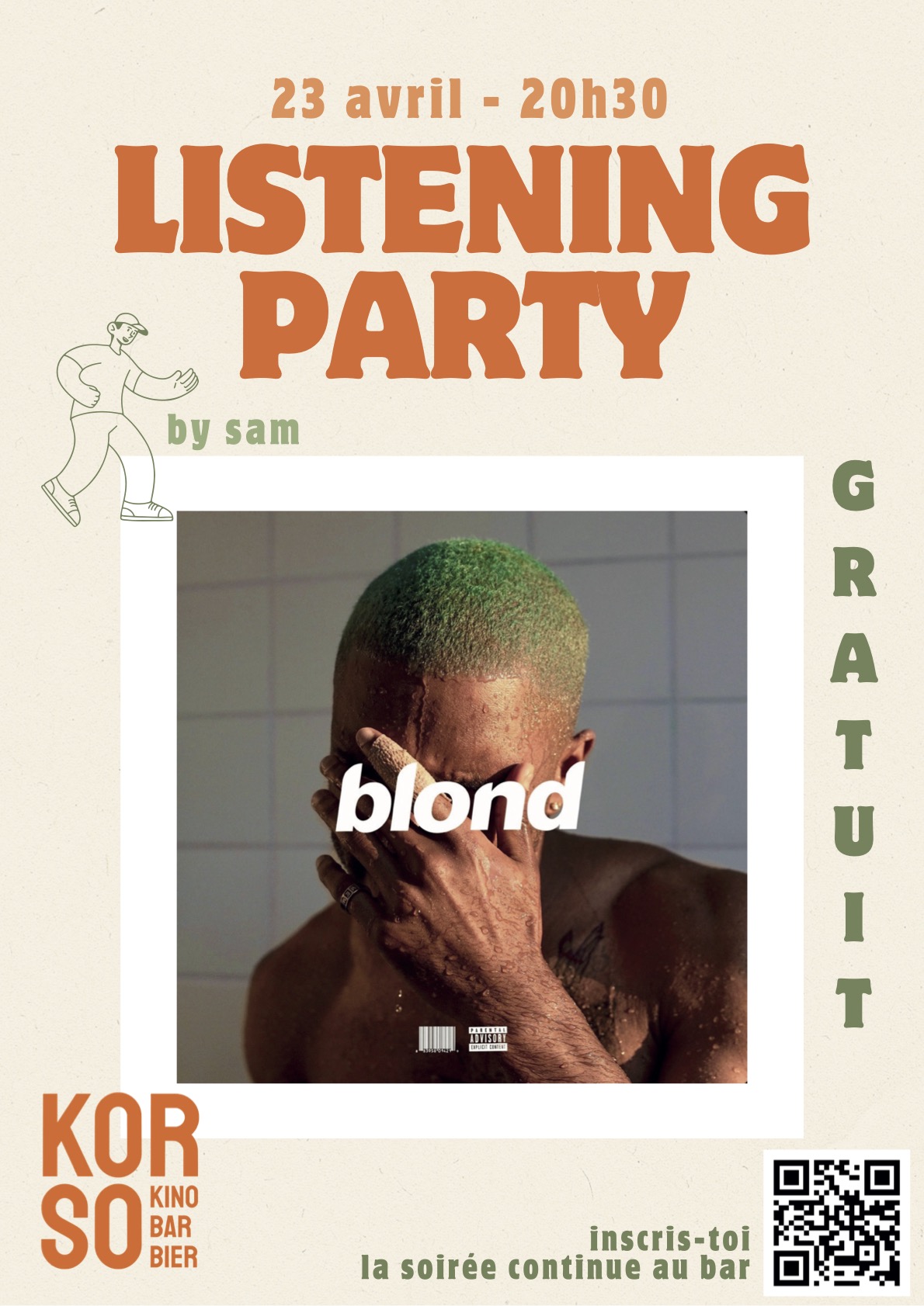 L'idée est simple: écouter activement l'album Blonde, de Frank Ocean de A à Z, dans une atmosphère captivante et interactive, où des visuels projetés au cinéma accompagneront les morceaux. Pleins d'histoires, d'anecdotes et d'explications liées à l'univers de Frank Ocean seront présentées lors de la soirée. Cet album iconique sorti en 2016, mélange différents styles et relate de nombreux thèmes autour de la jeunesse. Nul besoin de connaître l'album ou l'artiste, le but est de passer un moment autour du langage universel de la musique !